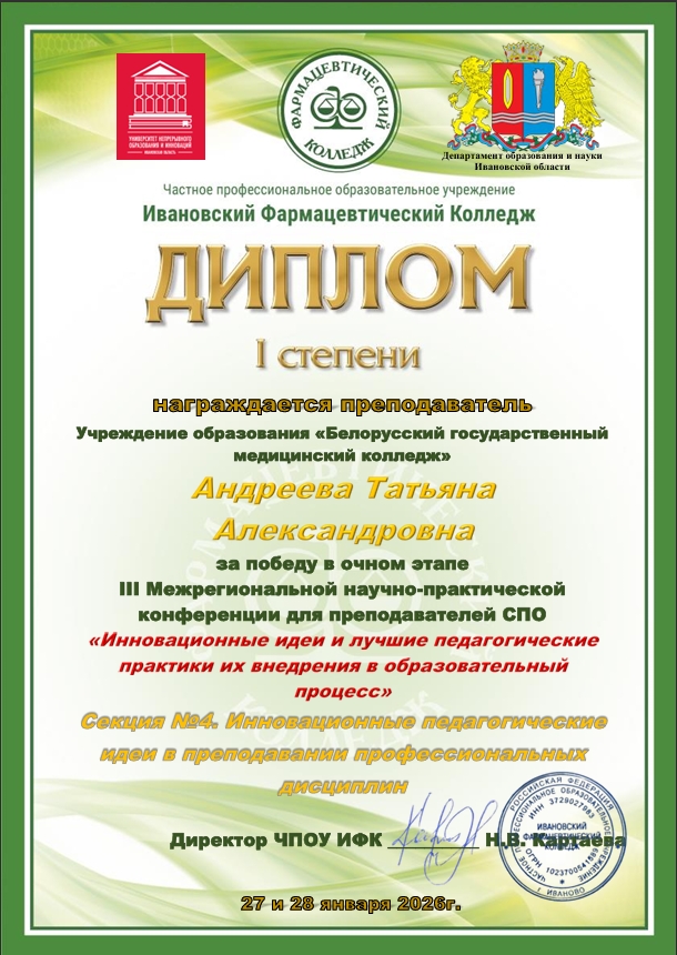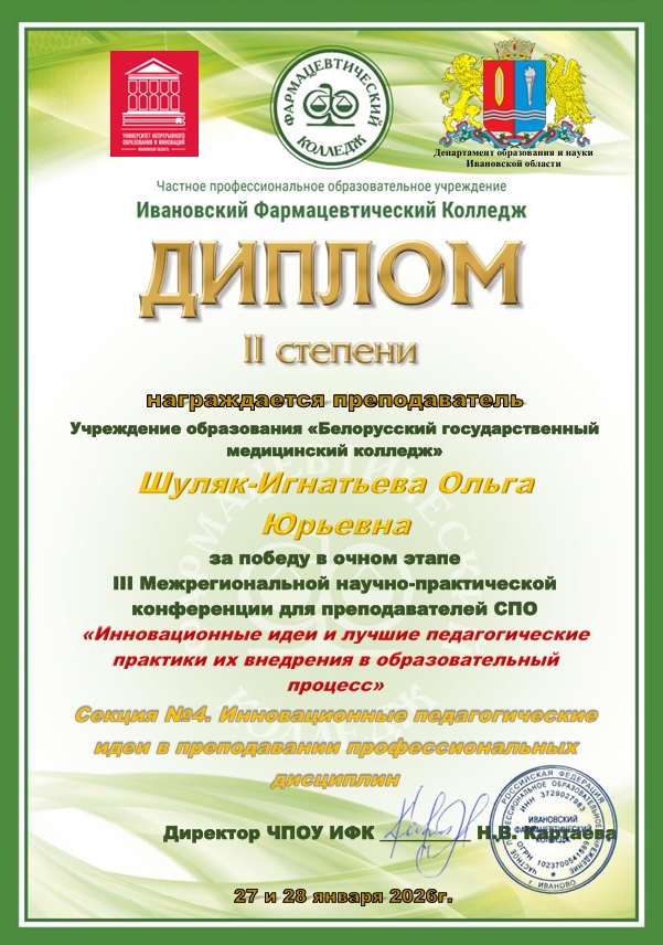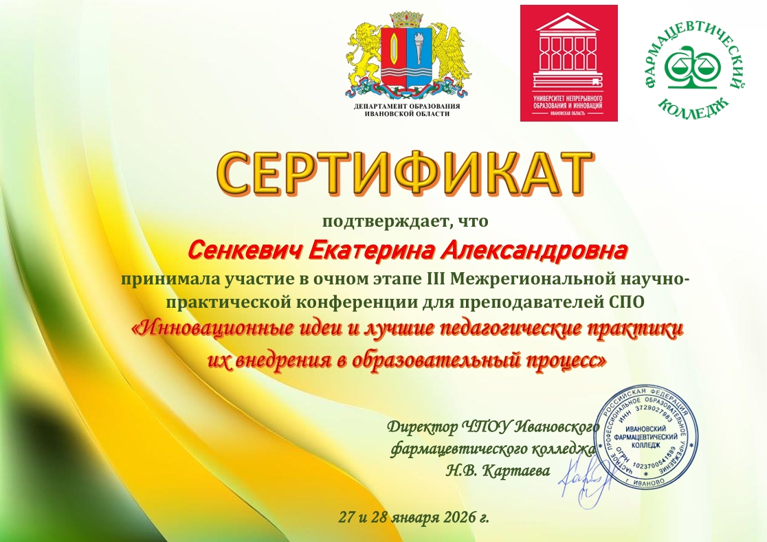 27 и 28 января 2026 года на базе ЧПОУ «Ивановский фармацевтический колледж» состоялась межрегиональная научно-практическая конференция для преподавателей средних профессиональных образовательных организаций «Инновационные идеи и лучшие педагогические практики их внедрения в образовательный процесс».