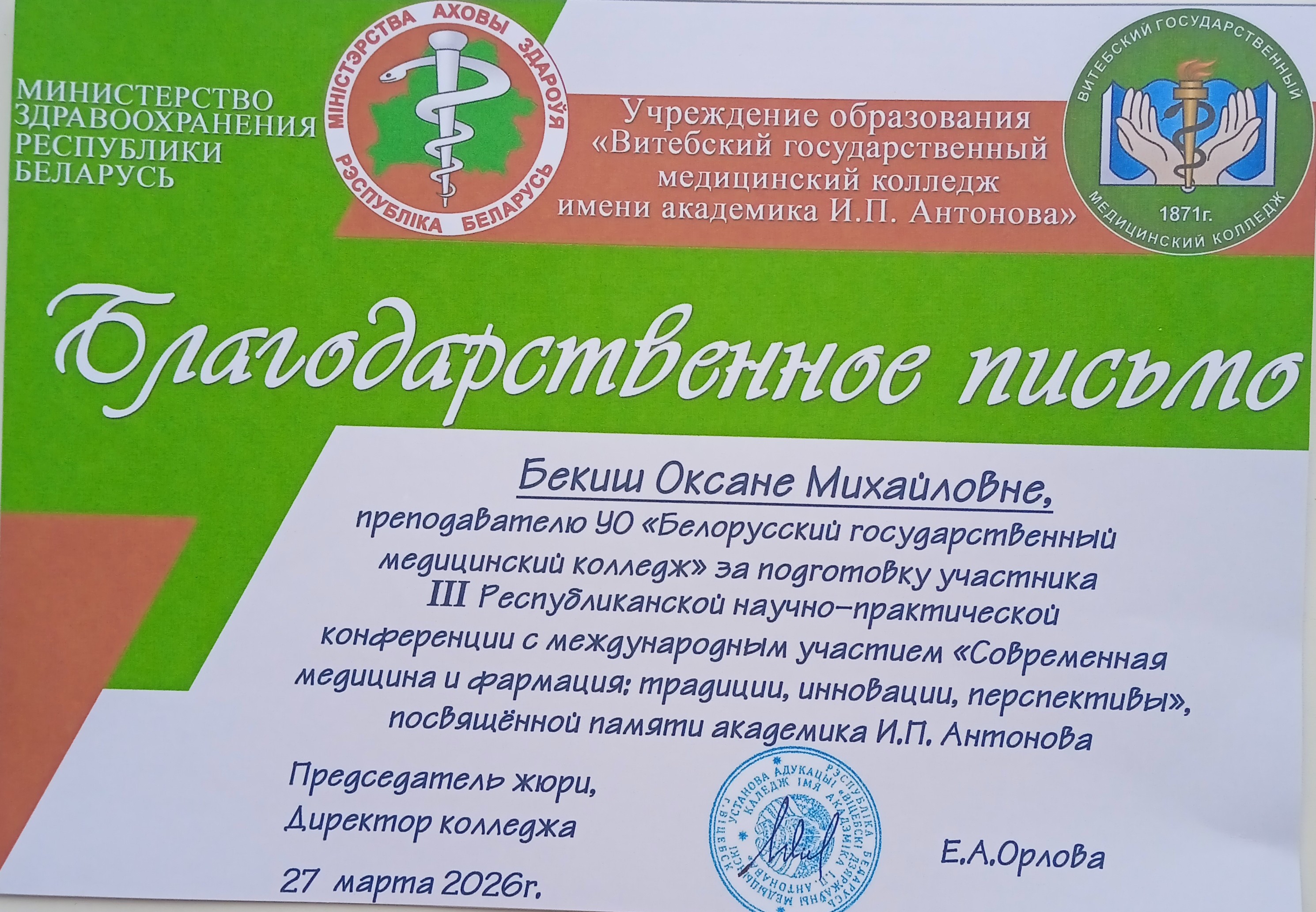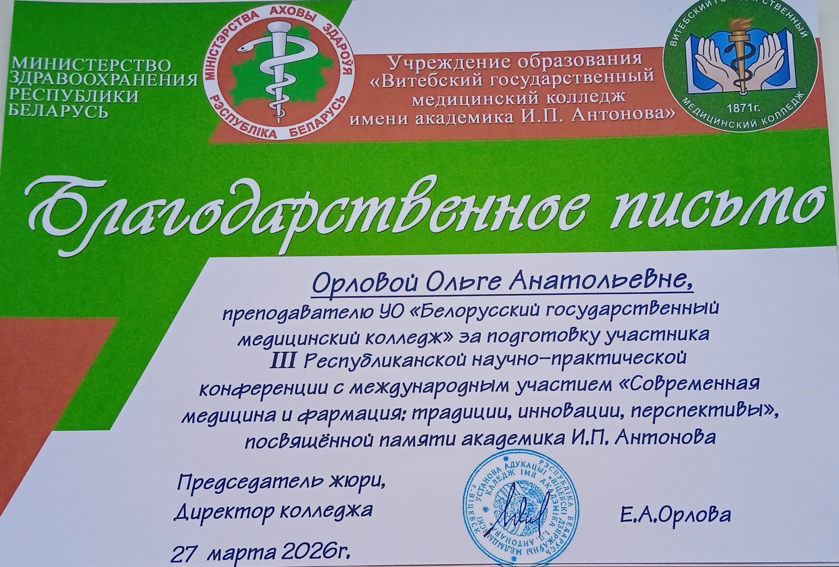 27 марта 2026 года состоялась III-я республиканская научно-практическая конференция с международным участием «Современная медицина и фармация: традиции, инновации, перспективы», посвященная памяти академика Игнатия Петровича Антонова, которая проходила на базе учреждения образования «Витебский государственный медицинский колледж имени академика И.П. Антонова».