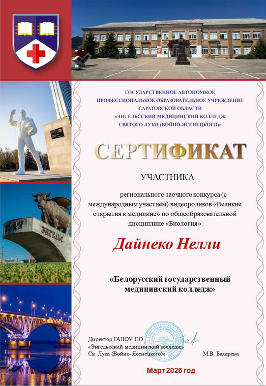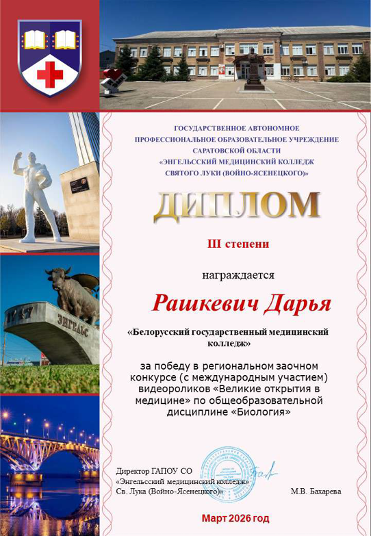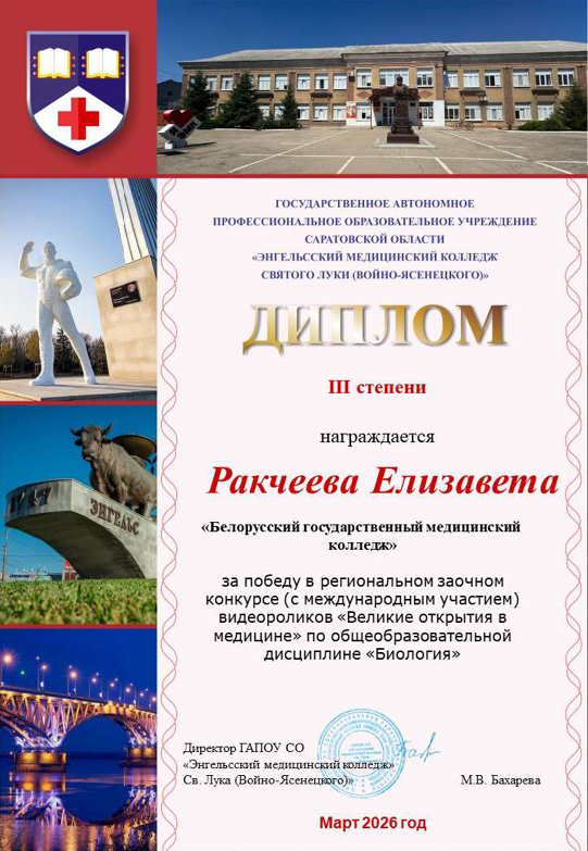 С 23.02.2026 по 13.03.2026 проходил региональный заочный конкурс (с международным участием) видеороликов «Великие открытия в медицине» по общеобразовательному предмету «Биология», организатор конкурса − ГАПОУ СО «Энгельсский медицинский колледж Святого Луки (Войно-Ясенецкого)»